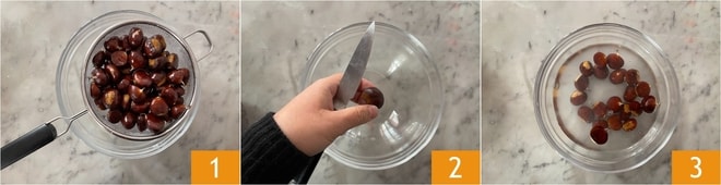 Pour préparer les châtaignes au micro-ondes, commencez par choisir les meilleures châtaignes, non percées. Lavez-les bien sous l'eau et égouttez-les 1. Incisez-les avec un couteau 2 et placez-les dans un bol. Couvrez d'eau et laissez-les reposer pendant environ dix minutes 3.
