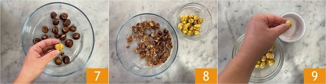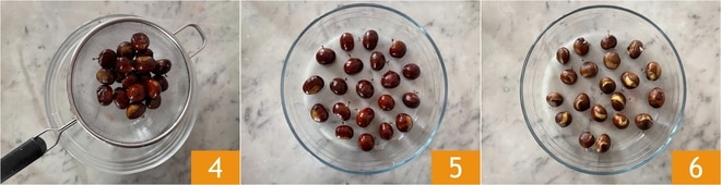 Égouttez-les à nouveau 4 et transférez-les dans un plat adapté à la cuisson au micro-ondes 5. Faites cuire les châtaignes au micro-ondes avec la fonction combinée (micro-ondes + grill) à 1000 W ou à la puissance maximale pendant 5 minutes. Terminez la cuisson en utilisant uniquement le grill pendant 2 minutes supplémentaires 6.