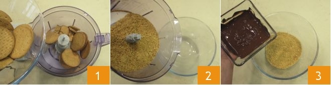 Pour préparer le cheesecake à l'avocat, commencez par la base : émiettez très finement les biscuits en utilisant un robot culinaire 1, puis transférez-les dans un bol 2. Faites fondre le chocolat noir au micro-ondes ou au bain-marie ; une fois tiédi, versez-le sur les biscuits émiettés 3