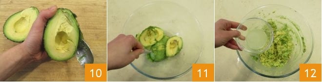 puis retirez la pulpe avec une cuillère 10 et écrasez-la délicatement dans un bol avec une fourchette 11. Saupoudrez avec 15 g de jus de citron vert 12 et mélangez.