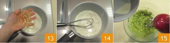 Versez la crème dans une petite casserole et portez à frémissement ; quand la gélatine sera ramollie, essorez-la délicatement et versez-la dans la crème chaude 13, en mélangeant soigneusement avec un fouet (il est important que la gélatine se dissolve complètement) 14. Avec le batteur électrique à vitesse moyenne, travaillez l'avocat écrasé, en versant le mélange de crème et gélatine 15,