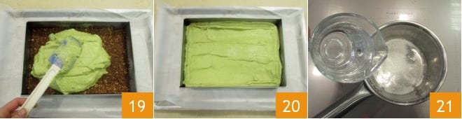 nivelez-la avec une spatule (19-20) et remettez le gâteau au réfrigérateur pendant au moins 20 minutes. Passez maintenant à la préparation des décorations pour votre cheesecake : versez la gélatine en poudre dans une petite casserole, puis ajoutez l'eau 21