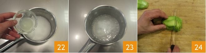 et 7 g de jus de citron vert 22 ; mélangez le tout avec un fouet manuel et à feu doux pendant environ deux minutes 23. Retirez la gélatine du feu et laissez-la tiédir ; pour vous aider, vous pouvez la verser dans une petite carafe. Pendant que la gélatine refroidit, nettoyez le troisième avocat : procédez comme pour les autres, en le divisant en deux, en retirant le noyau et en extrayant la pulpe, puis coupez seulement une moitié en tranches très fines 24.