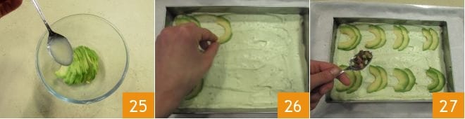 Versez un peu de jus de citron vert sur les tranches pour qu'elles ne noircissent pas. Divisez idéalement les rectangles en 8 parts et placez deux tranches d'avocat légèrement superposées et bien espacées les unes des autres jusqu'à obtenir ceux qui deviendront ensuite les 8 carrés 26, décorez avec les pistaches 27
