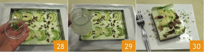 répartissez le zeste de citron vert 28, puis versez la gélatine préparée précédemment et tiédie 29. Remettez votre cheesecake à l'avocat au réfrigérateur pendant au moins une heure pour raffermir à nouveau, puis servez-le déjà portionné 30.