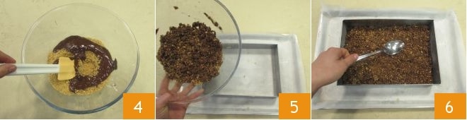et mélangez soigneusement 4. Tapissez un moule bas de papier sulfurisé, puis déposez-y un cadre rectangulaire sans fond de dimensions 25x17,5 cm. Versez le mélange de biscuits et chocolat à l'intérieur et nivelez-le à l'aide du dos d'une cuillère 6. Placez le moule au réfrigérateur pendant au moins une heure pour bien compacter la base biscuitée.