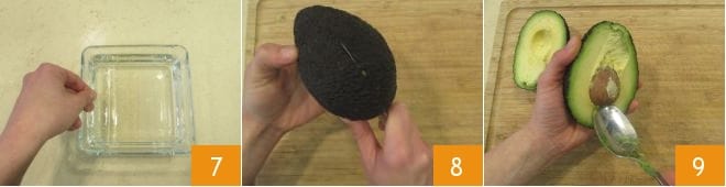 Entre-temps, préparez la crème : faites tremper les feuilles de gélatine dans un petit bol avec de l'eau froide 7 pendant au moins 10 minutes. Pendant ce temps, ouvrez 2 avocats, en les divisant en deux 8 : retirez d'abord le noyau (si vous ne le jetez pas, vous pouvez le faire germer en l'immergeant dans l'eau de manière à ce que la base du noyau soit bien immergée dans l'eau),