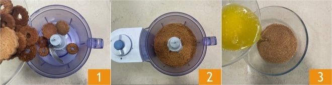 Pour préparer la cheesecake au fruit de la passion, versez les biscuits dans le mixeur 1 et réduisez-les en poudre fine 2. Versez le hachis dans un bol et ajoutez le beurre fondu 3.