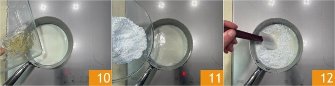 Faites fondre à l'intérieur la gélatine ramollie 10 et versez le sucre 11, mélangez pour amalgamer 12.