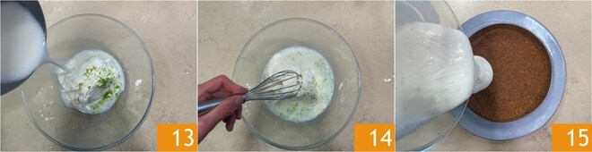 Versez le mélange dans le bol 13 et mélangez 14. Sortez la base du réfrigérateur et remplissez le cercle avec la crème 15.