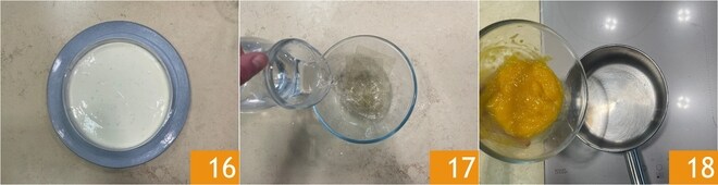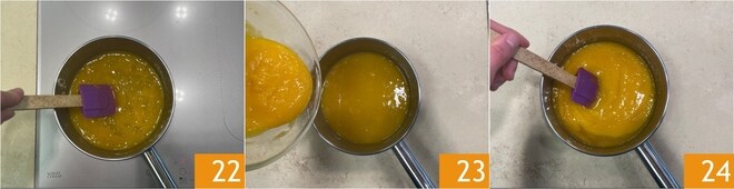 Mélangez pour amalgamer 22, une fois que la gélatine est dissoute, versez la purée de fruit de la passion 23 et mélangez 24.