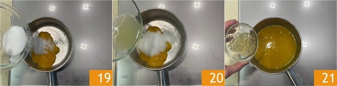 Assaisonnez avec le sucre 19 et le jus de citron vert 20. Chauffez le mélange et incorporez la gélatine essorée 21.