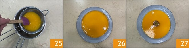 Filtrez la gelée à travers une passoire pour éliminer d'éventuels grumeaux 25. Versez ensuite la gelée sur la base solidifiée 26 et remettez au congélateur pendant 20 minutes pour refroidir. Servez la cheesecake au fruit de la passion garnie d'un demi-fruit 27.