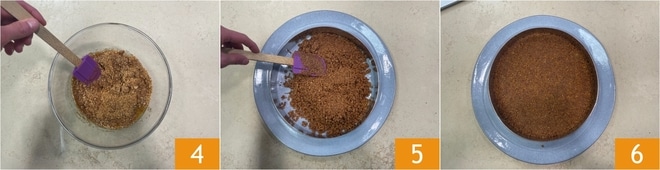 Mélangez pour amalgamer 4. Versez le mélange dans un cercle de 24 cm de diamètre placé sur un plat de service 5, pressez bien avec le dos d'une cuillère pour répartir et compacter la base 6. Placez au réfrigérateur pendant 30 minutes.