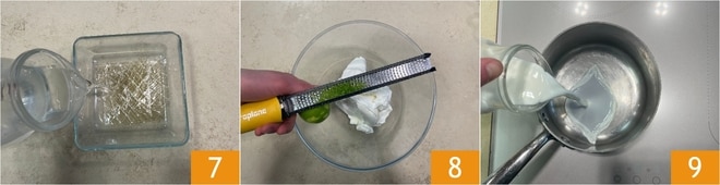 Préparez la crème : mettez la gélatine à tremper dans de l'eau froide pendant 10 minutes 7. Dans un bol, versez le fromage et aromatisez avec le zeste de citron vert 8. Dans une petite casserole, chauffez le lait 9.