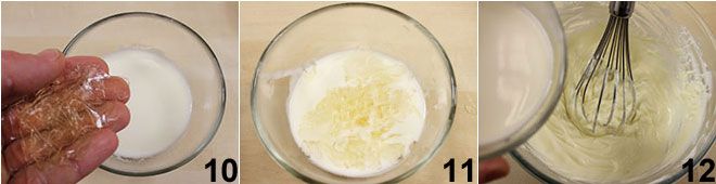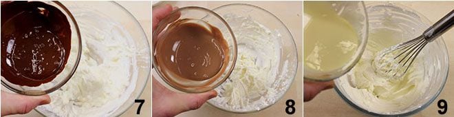 Maintenant, prenez trois bols et faites ramollir la gélatine nécessaire pour chaque crème (3 g) séparément dans de l'eau froide pendant 10 minutes. Ensuite, prenez 3 autres bols et versez dans chacun 80 ml de crème, que vous aurez préalablement chauffée, et dans chacun faites fondre la gélatine bien essorée (3 g pour chaque bol) (10-11). À la fin, vous devrez obtenir 3 bols contenant chacun 80 ml de crème et 3 g de gélatine dissoute. Incorporez le premier des 3 mélanges de crème et de gélatine au chocolat blanc en utilisant un fouet 12.