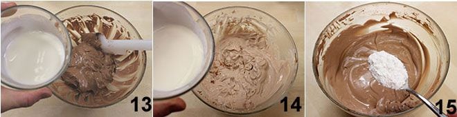 Faites la même opération pour les autres bols de crème et de gélatine, en les incorporant aussi bien dans le chocolat au lait que dans celui noir (13-14). Enfin, ajoutez le sucre glace en mélangeant avec une spatule 15.