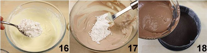 Faites la même opération pour tous les types de chocolat (16-17). Maintenant que les crèmes sont prêtes, vous pouvez composer le cheesecake, sortez du réfrigérateur le fond de biscuit désormais froid et compact, commencez à verser d'abord la crème au chocolat noir 18, laissez reposer au réfrigérateur ou au congélateur pendant 15-20 minutes.