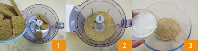 Pour réaliser le cheesecake aux fraises, commencez par préparer la base : faites fondre le beurre à feu très doux et laissez tiédir. Mettez les biscuits dans le mixeur 1 et actionnez les lames jusqu'à les réduire en une poudre fine 2. Transférez les biscuits dans un bol, versez le beurre fondu tiédi 3 et mélangez pour amalgamer.