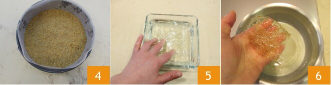 Versez le mélange obtenu dans un moule à charnière de 23 cm de diamètre beurré et chemisé avec du papier sulfurisé au fond et sur les bords. Avec le dos d'une cuillère, pressez bien le mélange dans le fond du moule pour obtenir une base compacte et lisse 4. Laissez reposer le mélange au congélateur pendant au moins une demi-heure pour que la base devienne solide. Maintenant, préparez la crème. Faites tremper 9 g de gélatine en feuilles dans de l'eau froide pendant environ 10 minutes 5. Chauffez la crème dans une casserole, ajoutez le sucre, faites bien dissoudre et puis incorporez la gélatine essorée hors du feu 6.