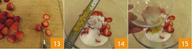 Après 3 heures, lavez les fraises et coupez-les en rondelles de 2-3 mm 13, ajoutez le sucre semoule, le zeste de citron 14 et son jus 15.