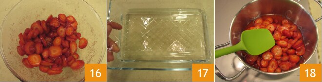 Mélangez et laissez macérer pendant environ 30 minutes à température ambiante 16. Après 20 minutes, faites tremper 7 g de gélatine dans de l'eau froide pendant 10 minutes 17. Puis reprenez les fraises macérées avec le sucre et le citron et versez-les dans une casserole 18.
