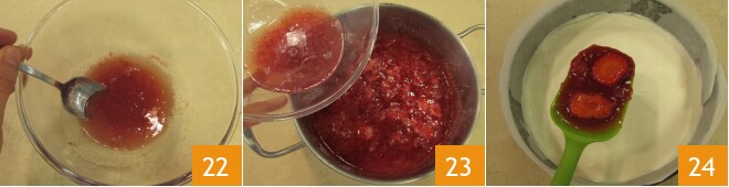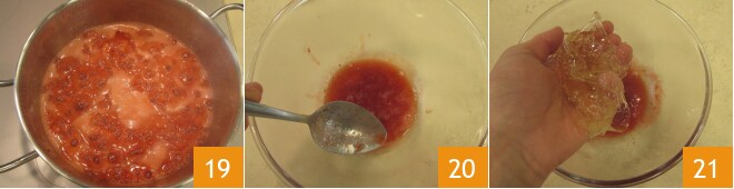 Faites cuire pendant 5 minutes à feu vif 19. Puis éteignez le feu, prélevez 3-4 cuillères à soupe de jus de fraises chaud et versez-le dans un bol 20, dissolvez-y la gélatine ramollie et essorée 21.