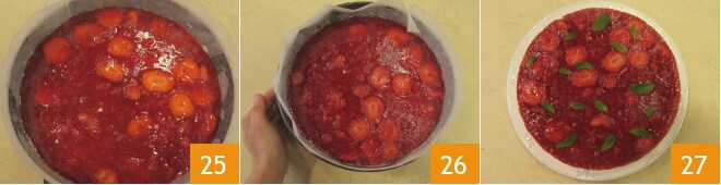 Mélangez jusqu'à ce qu'elle soit complètement dissoute 22, puis versez-la dans la casserole avec le reste du mélange 23. Laissez refroidir et versez le coulis de fruits sur la crème du cheesecake 24.