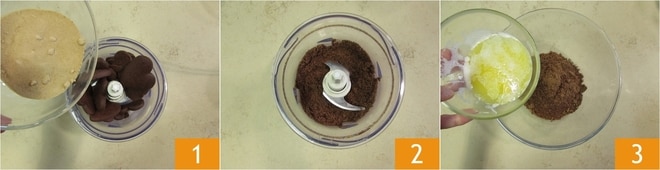 Pour réaliser la cheesecake aux fraises, commencez par la base : faites fondre le beurre à feu doux ou au micro-ondes et laissez-le tiédir. Versez dans le mixeur les biscuits, le sucre de canne 2 et mixez jusqu'à les réduire en miettes 2. Transférez dans un bol et ajoutez le beurre fondu 3.