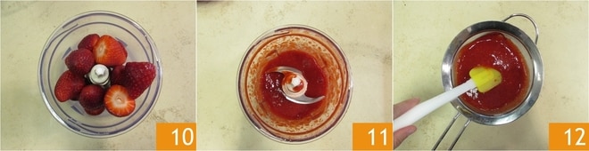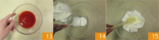 Mettez de côté votre coulis de fraises 13. Versez dans un bol la ricotta et le mascarpone 14, puis mélangez avec une spatule pour les assouplir.
