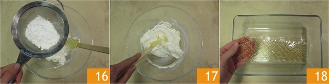 Tamisez le sucre glace peu à peu à l'intérieur des fromages 16 et mélangez jusqu'à ce qu'il soit complètement absorbé 17. Mettez la gélatine à tremper dans de l'eau froide 18 et attendez quelques minutes.