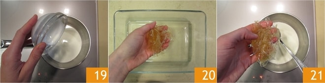Faites chauffer la crème sur le feu 19. Lorsque la crème commencera à bouillir, éteignez le feu. Égouttez la gélatine 20 et versez-la dans la crème 21.
