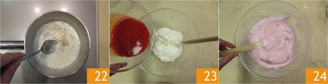 Mélangez avec une cuillère ou un fouet 22, jusqu'à ce qu'elle soit complètement dissoute. Laissez tiédir et en attendant, versez le coulis de fraises dans la crème aux fromages 23. Mélangez avec une marisa, jusqu'à obtenir une crème d'une couleur uniforme.