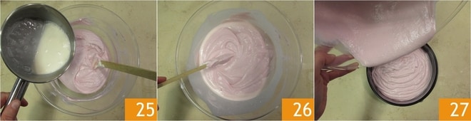 Versez maintenant la crème de lait et gélatine maintenant tiède 25 et mélangez bien, pour l'incorporer au reste des ingrédients 26. Sortez du réfrigérateur la base et versez le mélange dessus 27.
