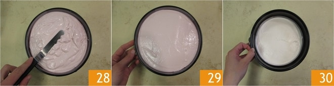 En utilisant une spatule 28, lissez bien la surface 29. Transférez au réfrigérateur pendant au moins 2 heures, afin de faire prendre le mélange. Au moment de servir, sortez la cheesecake du réfrigérateur et élargissez l'anneau pour l'extraire 30.