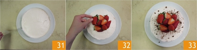 Transférez sur un plat de service et enlevez l'acétate sur les bords 31. Décorez avec des fraises fraîches 32 et des biscuits émiettés 33. La cheesecake aux fraises est prête à être servie.