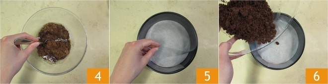 Mélangez bien 4 jusqu'à obtenir un mélange homogène. Maintenant, tapissez le fond d'un moule à charnière de 20 cm de diamètre avec du papier sulfurisé et les bords avec une bande d'acétate 5. Si vous n'avez pas d'acétate, vous pouvez utiliser également dans ce cas du papier sulfurisé. Versez à l'intérieur le mélange de biscuits 6.
