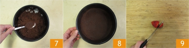 Compactez bien en vous aidant avec le dos d'une cuillère 7, pour une épaisseur uniforme 8. Placez la base au réfrigérateur pendant au moins une heure. Pendant ce temps, préparez la crème : lavez les fraises et éliminez la partie avec les feuilles 9.