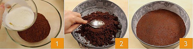 Pour préparer la cheesecake bananes et chocolat, commencez par la base : mettez les biscuits secs au cacao dans le mixeur, puis broyez-les finement. Faites fondre le beurre à feu doux dans une casserole ; pendant ce temps, mettez les biscuits émiettés dans un bol et ajoutez petit à petit le beurre fondu en mélangeant bien le tout 1. Beurrez un moule à charnière de 22 cm de diamètre ; découpez un disque de papier sulfurisé du même diamètre que le moule et deux bandes de la même hauteur que les bords. Si nécessaire, vous pouvez consulter la fiche sur comment tapisser un moule avec du papier sulfurisé. Placez ensuite les biscuits émiettés dans le moule recouvert de papier sulfurisé et aidez-vous du dos d'une cuillère pour bien compacter la base de biscuit 2. Faites refroidir la base au réfrigérateur pendant 30 minutes ou au congélateur pendant 15 minutes 3.