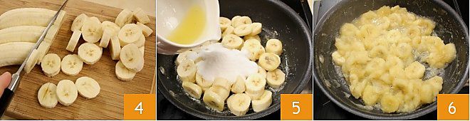 Consacrez-vous maintenant à la garniture : épluchez les bananes et coupez-les en tranches d'environ un demi-centimètre 4, mettez-les dans une poêle avec le beurre, le jus d'un demi-citron et 40 g de sucre 5. Faites cuire à feu moyen jusqu'à ce que les bananes soient tendres et crémeuses 6.