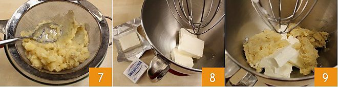 Passez ensuite les bananes cuites dans un tamis pour obtenir une pulpe homogène ou écrasez-les avec une fourchette 7. Dans un robot culinaire ou un grand bol, mettez le fromage frais à tartiner 8, ajoutez la pulpe de bananes 9 et enfin 60 g de sucre.