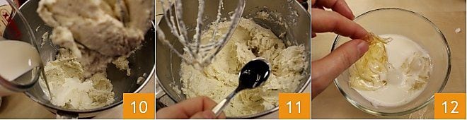 Commencez à mélanger les ingrédients avec les fouets du robot culinaire. Si vous ne possédez pas de robot, utilisez un batteur électrique ou un fouet. Ajoutez ensuite progressivement 100 ml de crème liquide fraîche 10 en continuant de mélanger le mélange. Enfin, parfumez la crème avec la cuillère à café d'extrait de vanille. Vous pouvez également utiliser un sachet de vanilline ou les graines d'une gousse de vanille 11. Ensuite, ramollissez la gélatine dans de l'eau froide pendant 10 minutes. Pour les détails du processus, vous pouvez consulter la fiche comment utiliser la gélatine. Essorez bien les feuilles de gélatine et dissolvez-les dans 1 cuillère à soupe de crème liquide chauffée 12.
