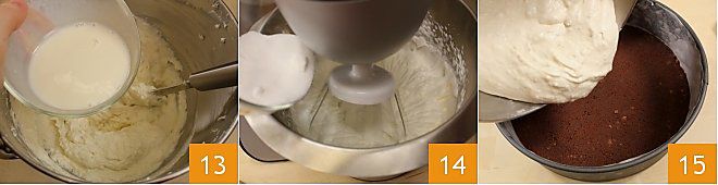 Laissez tiédir la crème jusqu'à ce qu'elle atteigne la température ambiante, puis incorporez-la à la crème de bananes. Remettez les fouets en marche pour bien amalgamer la crème 13. À part, montez le reste de la crème avec 60 g de sucre supplémentaires. Pour cette procédure, vous pouvez consulter la fiche comment monter la crème. Une fois montée, incorporez la crème à la crème de bananes, en mélangeant de bas en haut avec une spatule pour ne pas casser la crème 14. Versez la crème obtenue dans le moule que vous aurez sorti du réfrigérateur 15. Créez une couche uniforme de crème et laissez le gâteau se raffermir pendant au moins 4 heures au réfrigérateur.