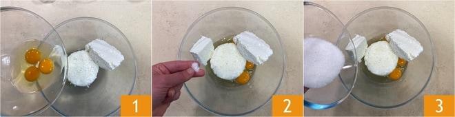 Pour préparer la cheesecake cuite avec le tvorog, commencez par faire fondre le beurre et laissez-le tiédir. Versez dans un grand bol le fromage tvorog, les œufs 1, le sel 2 et le sucre 3.