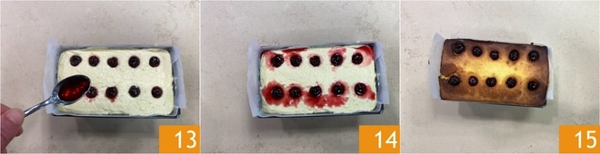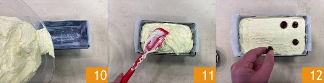 Versez le mélange dans un moule à cake de 25x11x7 cm tapissé de papier sulfurisé 10 et nivelez la surface 11. Insérez les cerises au sirop en deux rangées à distance régulière en appuyant légèrement 12.