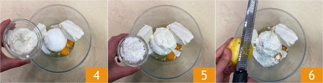 Ajoutez également la crème aigre 4 et la fécule de maïs 5, puis râpez le zeste de citron 6.