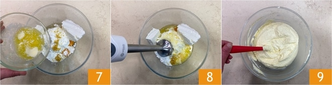 Enfin, ajoutez le beurre fondu et tiédi 7 et mixez avec un mixeur plongeant 8 jusqu'à obtenir un mélange homogène 9.