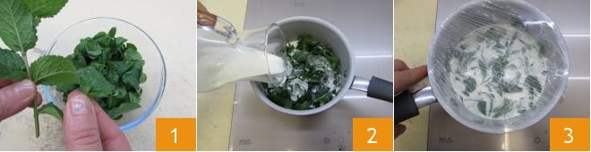 Pour préparer le cheesecake menthe et chocolat, commencez par l'infusion de feuilles de menthe. Détachez les feuilles des tiges, rincez-les sous l'eau courante puis séchez-les délicatement avec un torchon. Transférez les feuilles dans une casserole, versez 350 g de crème liquide fraîche (gardez 50 g de côté) et chauffez à feu doux pendant 3-4 minutes 2. Ensuite, éteignez le feu et laissez refroidir. Une fois refroidie, couvrez-la avec du film plastique et placez-la au réfrigérateur pendant au moins 4-6 heures 3.