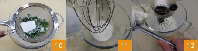 Après les 4 heures, reprenez l'infusion du réfrigérateur et filtrez le liquide en retenant les feuilles dans la passoire. Pressez bien pour recueillir toute la crème parfumée à la menthe 10. Montez ensuite la crème de l'infusion avec le sucre, en vous aidant d'un batteur sur socle équipé d'un fouet 11 (si vous n'en avez pas, vous pouvez utiliser un batteur électrique). Et avec les fouets encore en marche, ajoutez également le fromage à tartiner, jusqu'à obtenir un mélange homogène 12.