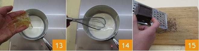 Chauffez les 50 g restants de crème liquide fraîche 13, éteignez le feu et faites fondre la gélatine bien égouttée et essorée : mélangez soigneusement avec un fouet jusqu'à ce qu'elle soit complètement dissoute 14, puis laissez refroidir. Râpez le chocolat noir 15